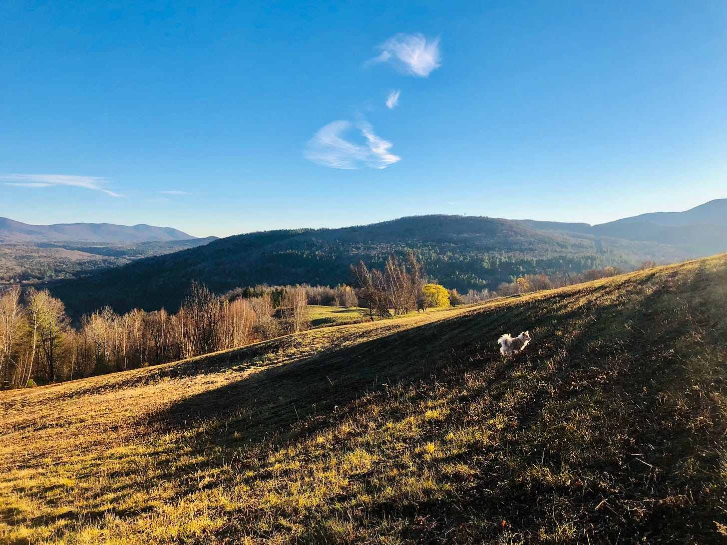 I’m back at my desk…..sort of. Typing is clumsy with a torn tendon in my right hand (surgery tomorrow will only make me more clumsy, I’m afraid, so I gotta get this done now). My thoughts are two paragraphs ahead of my two working fingers, which may never catch up before my ideas are indecipherable specs in the clouds—like Machias barking at crows who leave the field miles before he gets to them but still he hurtles every hair of his small body at the sky, undeterred.