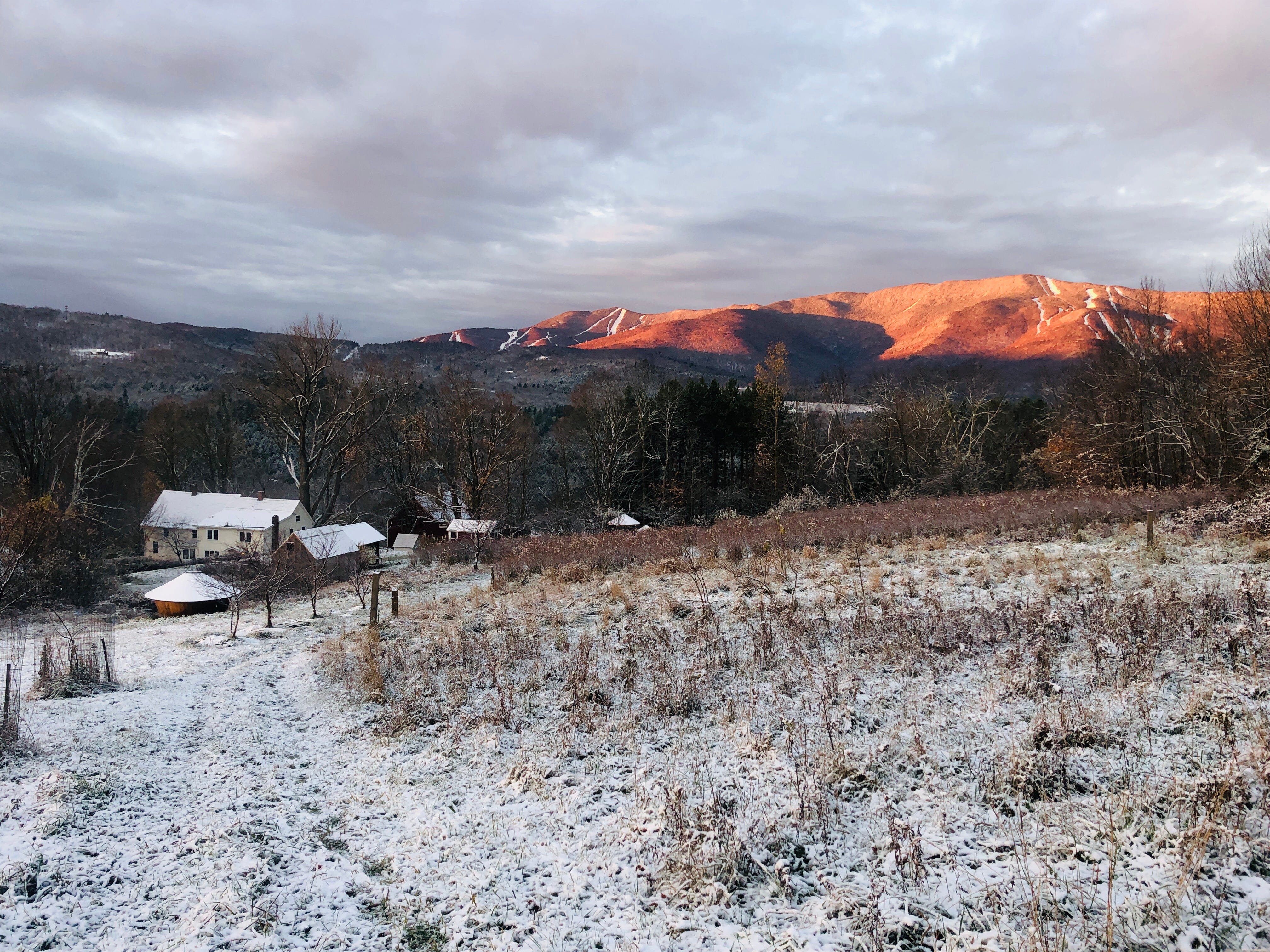 It’s early morning. There was snow in the night, our first snow of the winter, and it covers the long green grass and deep layer of maple leaves on our lawn. We are not prepared for this snow, have not done the fall chores required to live in a frozen state for the next six months. I’m looking out the window and thinking: these leaves be raked, the water lines down to the sheep fields must be drained, the greenhouse buttoned down… Most of all, the barn foundation is half-way replaced, the old concrete forming an enormous pile in the paddock.